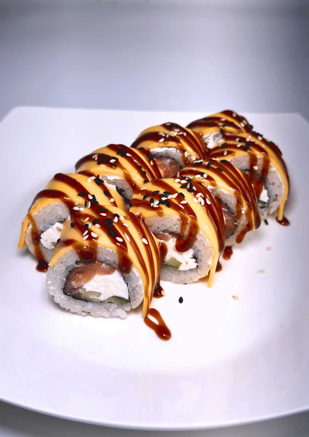 Рис, лосось, огурец, cыр Cremette, сыр чедр, унаги соус, кунжут