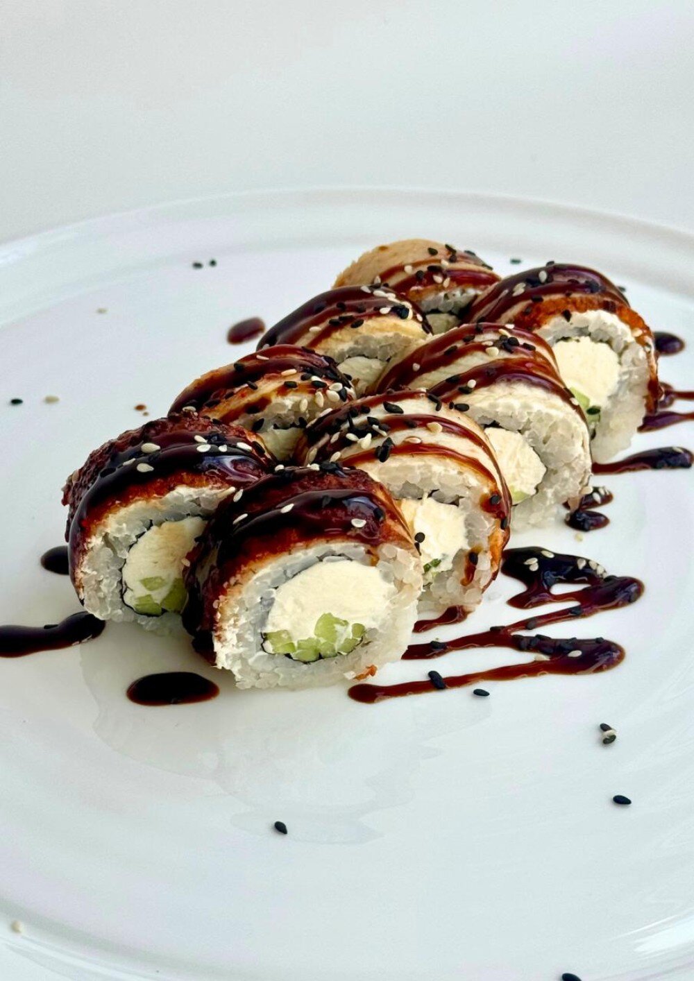 рис, угорь, cыр Cremette, огурец, унаги соус, кунжут
