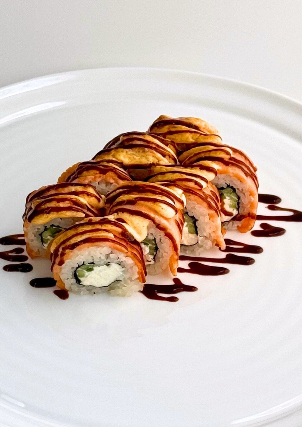 рис, лосось, огурец, cыр Cremette, соус Унаги, соус Спайси