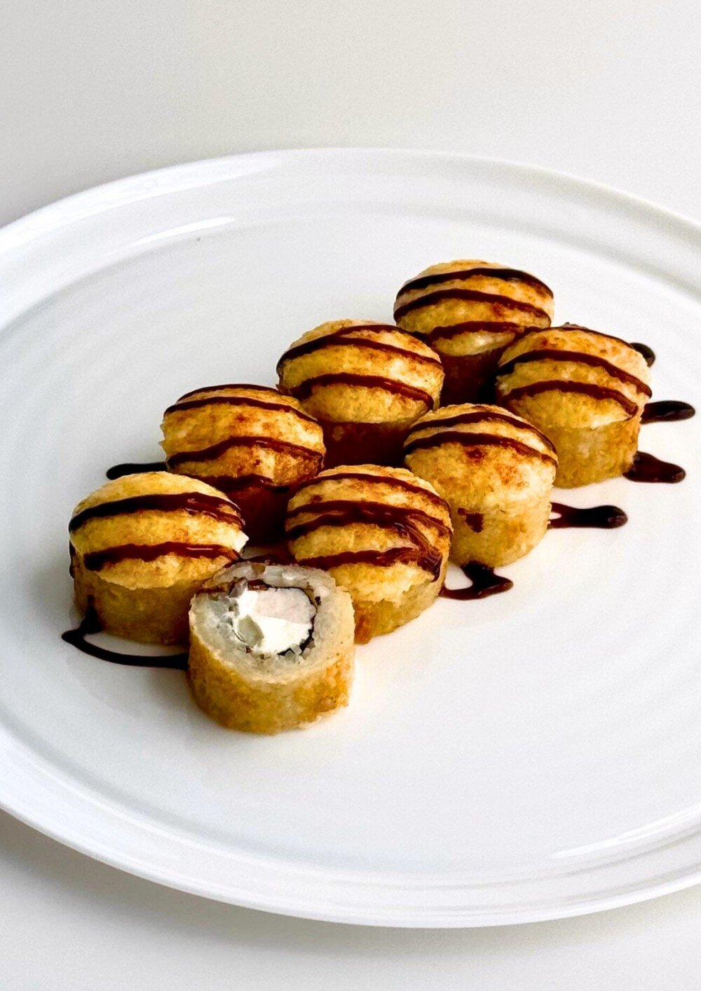 рис, копченная курица, пекинская капуста, cыр Cremette, соус для запекания, соус унаги
