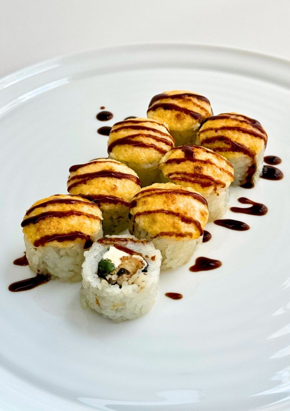 рис, угорь, чука, cыр Cremette, соус для запекания, унаги соус