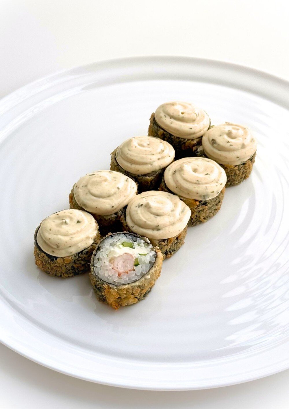 рис, креветка, cыр Cremette, огурец, пивной соус