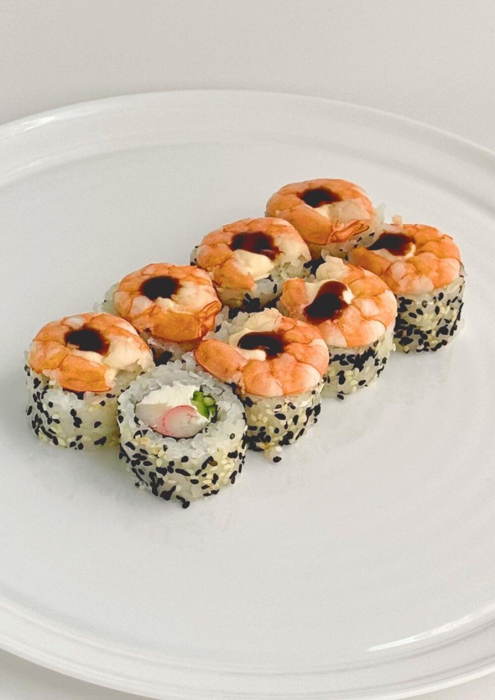 креветка, рис, cыр Cremette, крабовое мясо, огурец, кунжут
