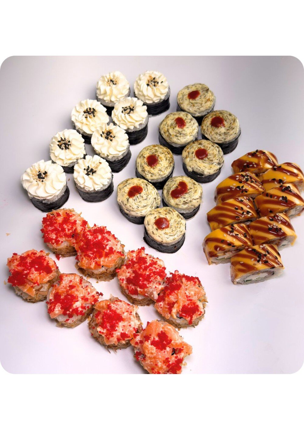 Поцелуй Гейши, Пина Колада, Пивной запеченный, Лосось Чедр, соевый 2шт, васаби 2 шт, имбирь 2шт